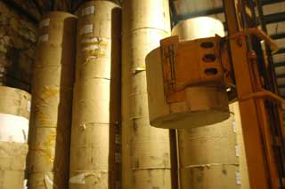 The ESP Printers warehouse where a machine is shown moving gigantic rolls of paper. The rolls are like tree trunks, reaching to the high ceiling.